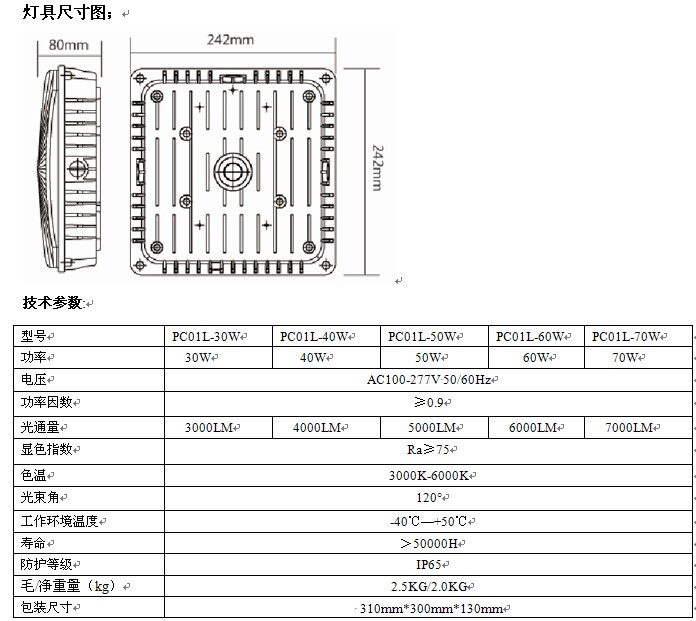 LED頂棚燈燈具特點(diǎn): 1.燈殼采用鋁合金高壓壓鑄,結(jié)構(gòu)輕巧,牢固,耐腐蝕。 2.透光罩采用高透光PC材料壓制而成,經(jīng)棱鏡折射光線柔和。 3.新型硅橡膠密封圈,耐高溫250度以上,保證硅橡膠不老化。 4.長(zhǎng)期保證防護(hù)等級(jí)IP65,采用耐高溫,耐高壓的硅橡膠電線。 5.燈具表面采用靜電噴塑處理,耐高溫性能良好,美觀耐用。 LED頂棚燈應(yīng)用場(chǎng)所: 適用于商場(chǎng),展示館,體育館,樓梯過道,隧道,地下過道,高架路橋,車庫(kù),停車場(chǎng)及建筑立面,公共走廊等室內(nèi)外照明。